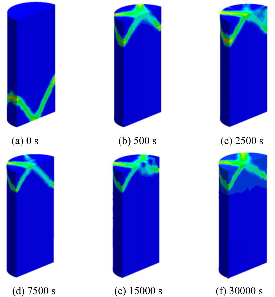试样中水的总体积含量随渗流时间的变化如图 11所示。由图可得,渗流刚开始,试样迅速达到饱和状态,试样中的水含量迅速上升至 0.5%(与试样的孔隙率一致),此部分水为自由水;随着渗流时间的持续增加,试样中的水含量继续增加,但增加趋势逐渐变缓,当渗流时间为 3×104s时,试样中的水的总体积含量已达 9.99%(该试样设置的最大吸水量为10%),此部分水体积主要由基质吸水贡献。