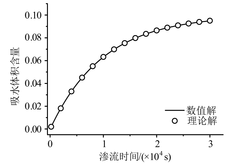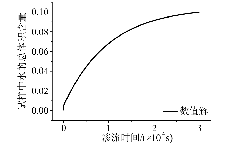 扣除图 11中的自由水体积,可得数值计算获得的基质吸水含量随时间的变化曲线如图12。由图可得,数值计算的结果与理论解式(21)趋势基本一致,表明了数值计算的正确性。