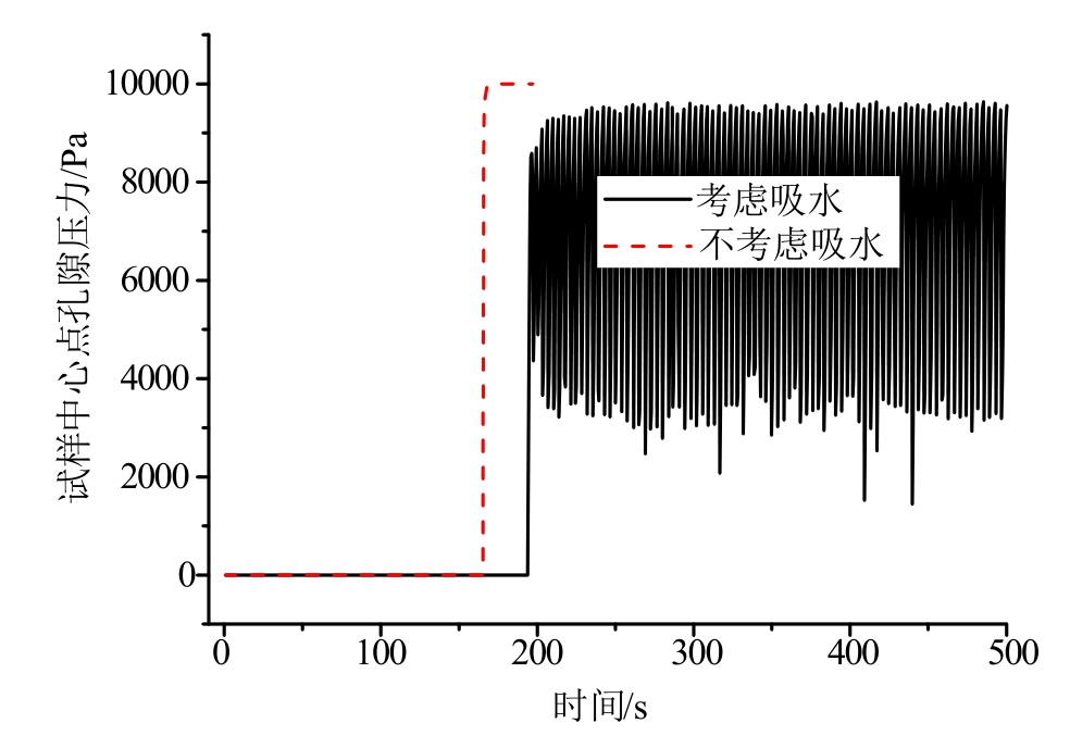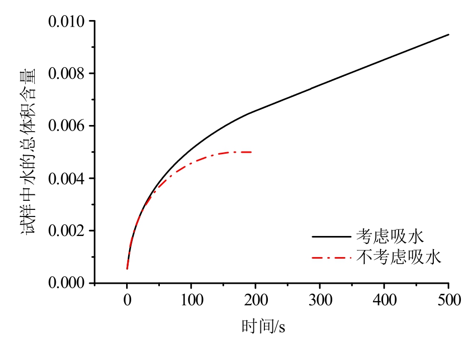 则考虑低压吸水及不考虑吸水两种工况下,w随时间的变化规律如图7所示。由图可得,随着渗流时间的增大,试样中水的体积含量逐渐增大。刚开始,两种工况下w随时间的变化规律基本一致;50 s以后,两种工况下的曲线逐渐分开。不考虑基质吸水的工况,由于试样中的水全部来自参与渗流计算的自由水,因此一旦渗流场达到稳定,水的体积含量基本保持不变,约为0.5%。考虑基质吸水的工况,随着渗流时间的增大,一方面外界的水逐渐渗透到试件内部,另一方面,试件内部孔隙中的自由水将被基质捕获,并以某种方式存储在基质中,因此即使渗流场达到稳定,试样中水的体积含量仍然在逐渐增加;当然,当试样达到最大吸水量后,试样中水的总体积含量将保持不变。从图7可以看出,当试样浸入水中的初期,渗流特性占主导,试样中的水大都为自由水;随着时间的推移,渗流效应逐渐减弱,而基质吸水效应将逐渐增强。