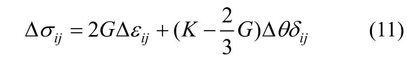 式中:∆σij为当前时步的应力增量;∆εij为当前时步的应变增量;∆θ为当前时步的体应变增量;K为体积模量;G为剪切模量;δij为Kronecker记号。