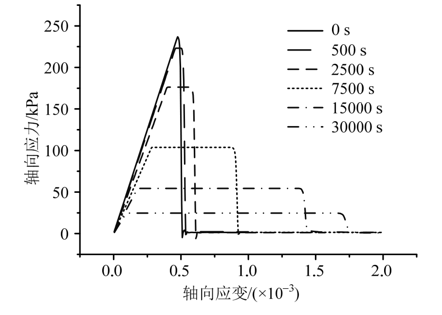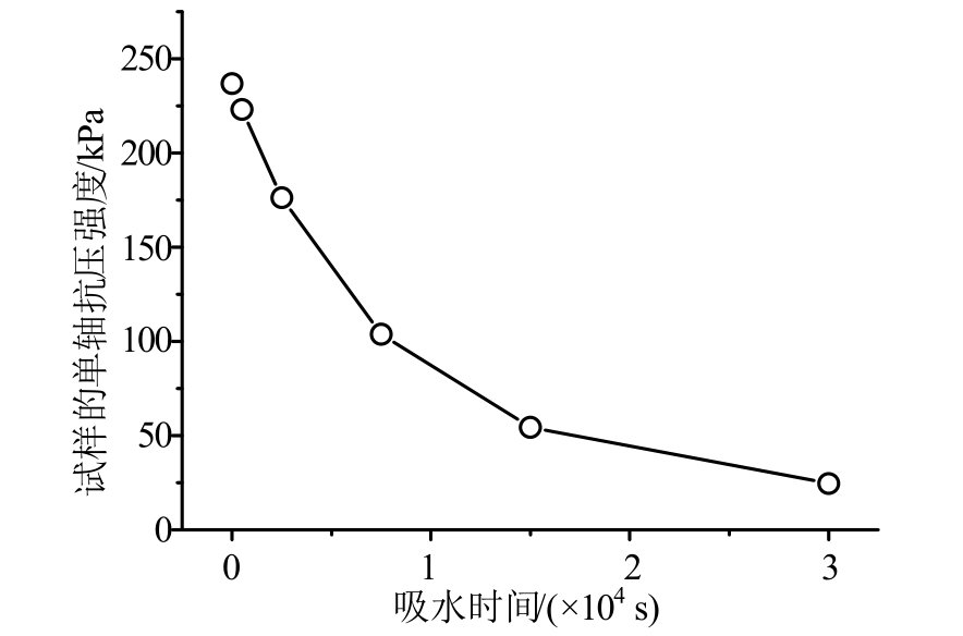 对图 15的曲线进行分析,可得试样的单轴抗压强度随吸水时间的变化规律(如图16所示)。由图可得,随着吸水时间的增大,试样的单轴抗压强度逐渐减小,但减小趋势逐渐变缓。干燥试样的单轴抗压强度约为237 kPa,吸水3×104s后试样的单轴抗压强度为24.6 kPa。