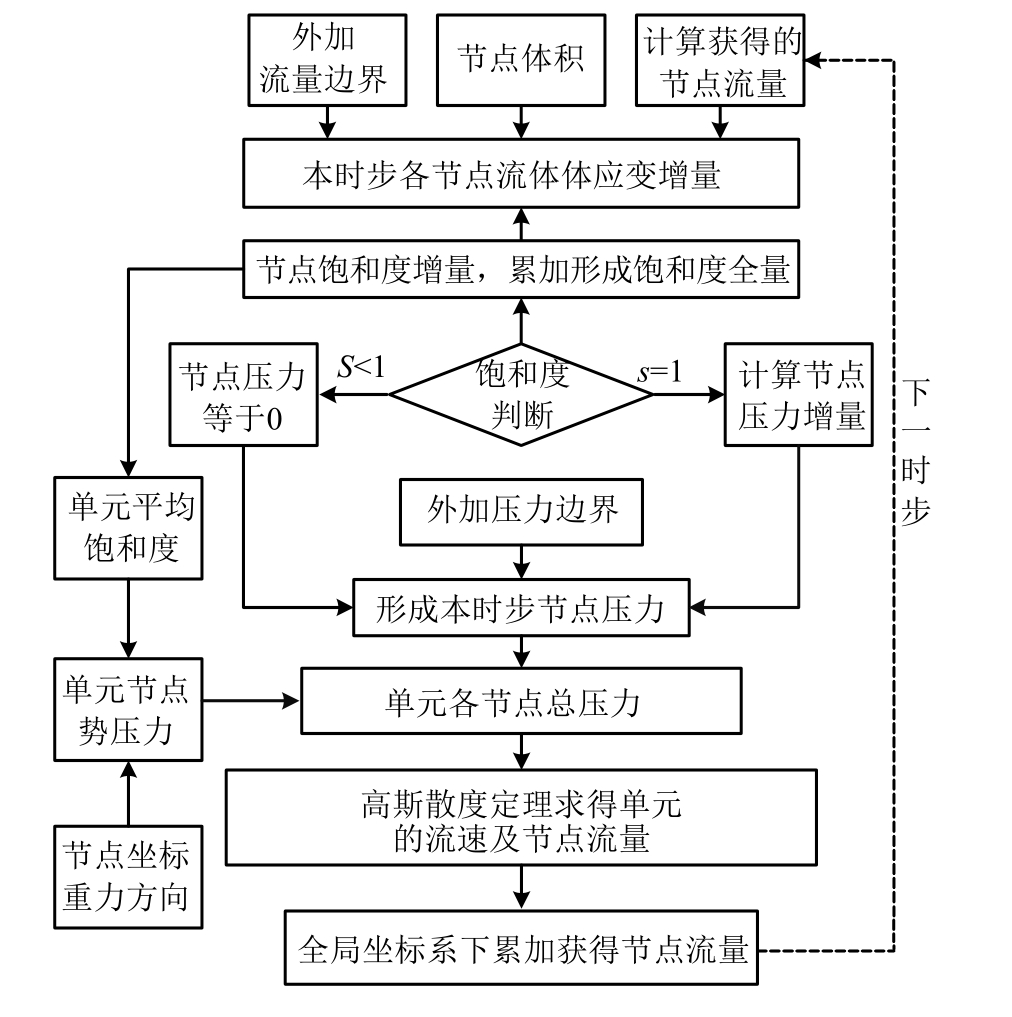如果某节点为压力边界条件施加节点,则节点孔隙水压力即为外界给定的压力。如果该节点不是压力边界条件节点,基于式(7)计算获得的节点流量计算当前时步的节点饱和度s为: