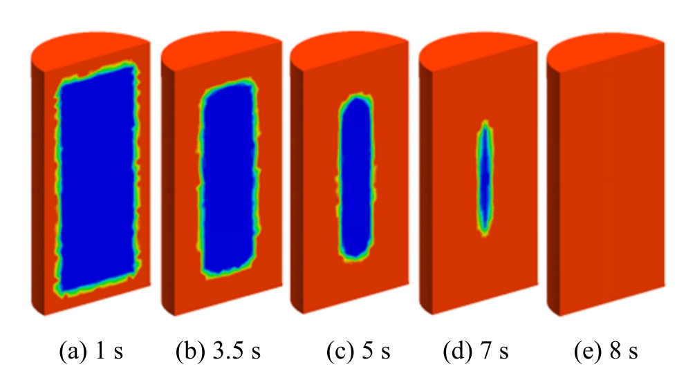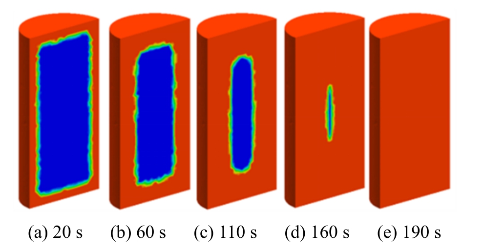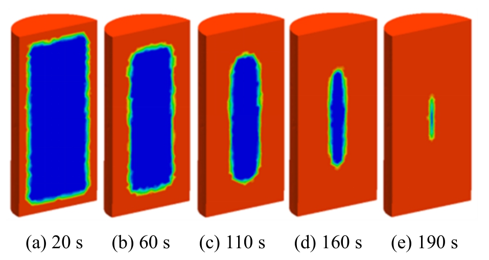 低压情况下,考虑及不考虑基质吸水特性时的饱和度随时间的演化规律如图5所示,图中浅色表示饱和度为1,深色表示饱和度为0。由图5及图6可得,不考虑吸水时的渗透速度明显快于考虑吸水时的渗透速度;从图5(e)及图6(d)的对比中可以看出,不考虑吸水时试样达到完全饱和的时间比考虑吸水时试样达到完全饱和的时间快30s左右。