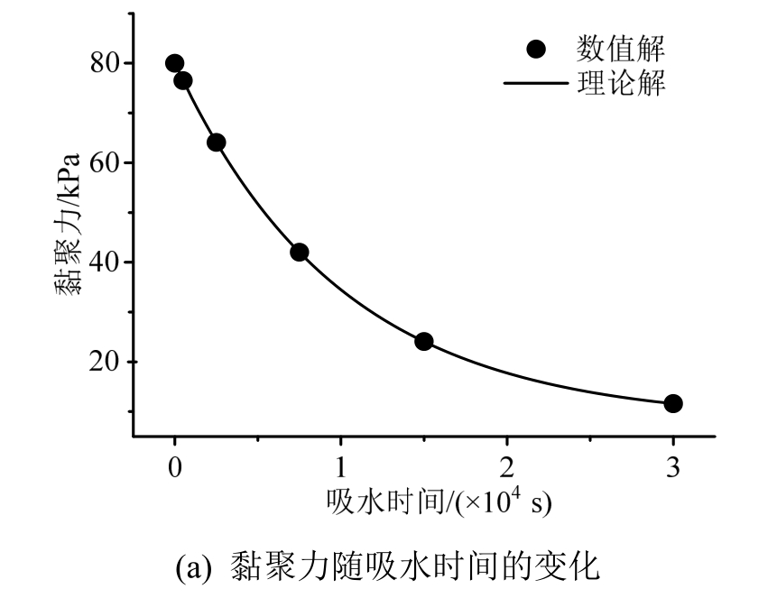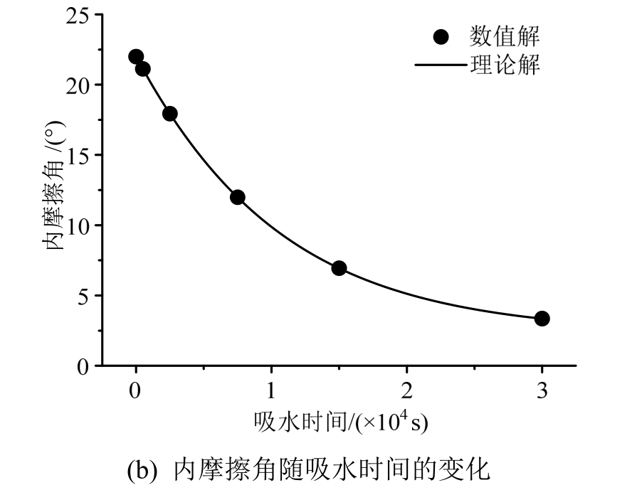 对高压(250 kPa)渗流下 500 s、2500 s、7500 s、15000 s及30000 s这5个典型时刻试样的平均黏聚力、内摩擦角进行统计,获得试样平均强度与吸水时间的关系,如图 14所示。由图可得,随着吸水时间的增加,试样的强度(黏聚力、内摩擦角)逐渐减小至残余值;数值解与理论解(式(29))基本一致,表明了数值算法的计算精度。