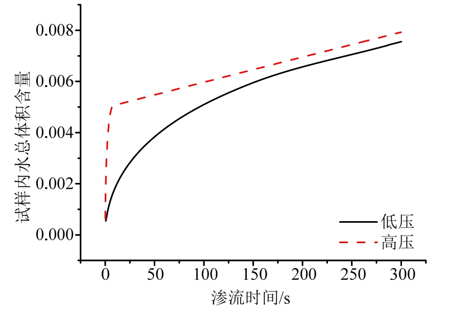 低压及高压状态下,在渗流初期,试样内水的总体积含量随时间的变化曲线如图 13所示。由图可得,渗流开始阶段,高压下试样中水的体积增加速率明显快于低压下的速率;但到了渗流后期,两种压力下的体积增加速率基本一致(基质吸水占主导);高压下的渗流过程与基质吸水过程分界线较为明显(曲线上存在转折点),而低压下两者的分界线不明显。