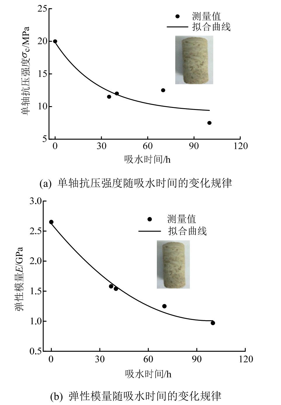 大量的岩石试样吸水实验表明[15―19],岩石试样的强度、弹模与吸水时间呈现指数下降型关系,具体如图2所示。