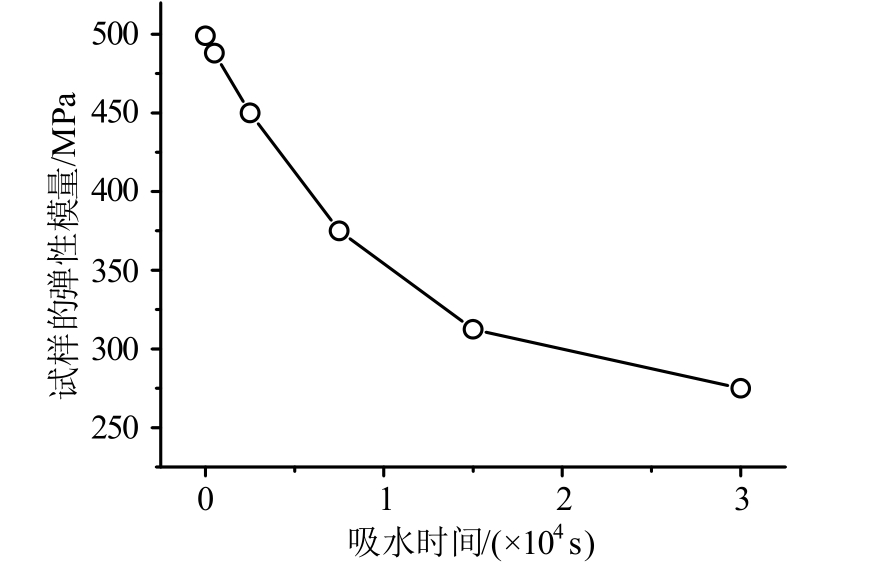 对图 16的曲线进行分析,可得试样的弹性模量随吸水时间的变化规律(如图17所示)。由图可得,随着吸水时间的增加,弹性模量逐渐减小,但减小趋势逐渐变缓。干燥试样的弹性模量为500 MPa,吸水3×104s后试样的弹性模量为263 MPa。