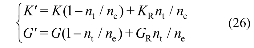式中:K′及G′为吸水率是nt时的体积模量及剪切模量;K、G为初始体积模量及剪切模量;KR及GR为达到最大吸水率 ne后的残余体积模量及残余剪切模量。