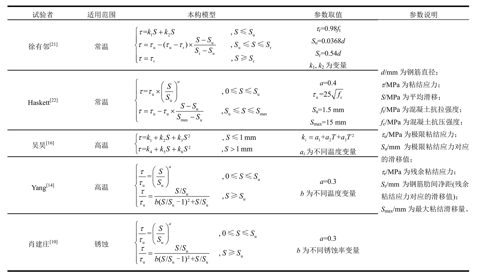 由于钢筋与混凝土界面受力复杂、影响因素诸多,从表中相关学者提出的粘结-滑移本构关系式可以发现,计算模型中相关参数随着温度、锈蚀率的变化而变化,其适用性范围相当局限。