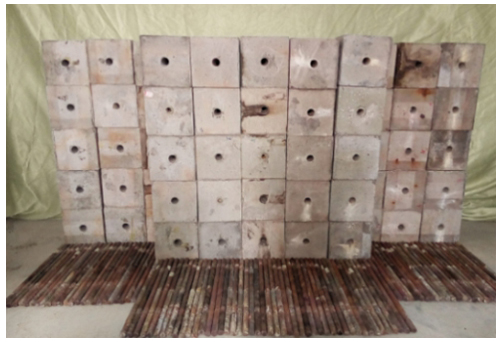 试件制作参照《混凝土结构试验方法标准》(GB/T 50152―2012)。采用拉拔试件测试粘结性能,试件尺寸为200 mm×200 mm×200 mm,试件分锈蚀组(平均钢筋锈蚀率为1.08%)与非锈蚀组,每组25个试件,每组试件分别设定为20 ℃(常温),200 ℃、400 ℃、600 ℃、800 ℃五个温度等级。试件锚固钢筋采用直径为20 mm的HRB500变形钢筋,浇筑于立方体试件中心位置,内配置三道