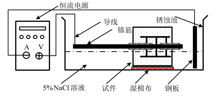 本试验采用电化学方法进行加速锈蚀,装置如图2所示。标准养护28 d后,将多个试件串联放入5%的NaCl溶液中浸泡7 d后(液面以不超过钢筋底面为准)接通电源,恒流电源内含安培表与变阻器,通过安培表测定通过锈蚀钢筋的电流大小,电流密度为 0.2 mA/cm2(Tondolo[7]认为当电流密度超过0.25 mA/cm2时,相比于实际工程中钢筋锈蚀,加速锈蚀后的粘结性能将产生消极的影响)。根据法拉第定律,通过控制电流大小与通电时间可以控制钢筋的理论锈蚀率。