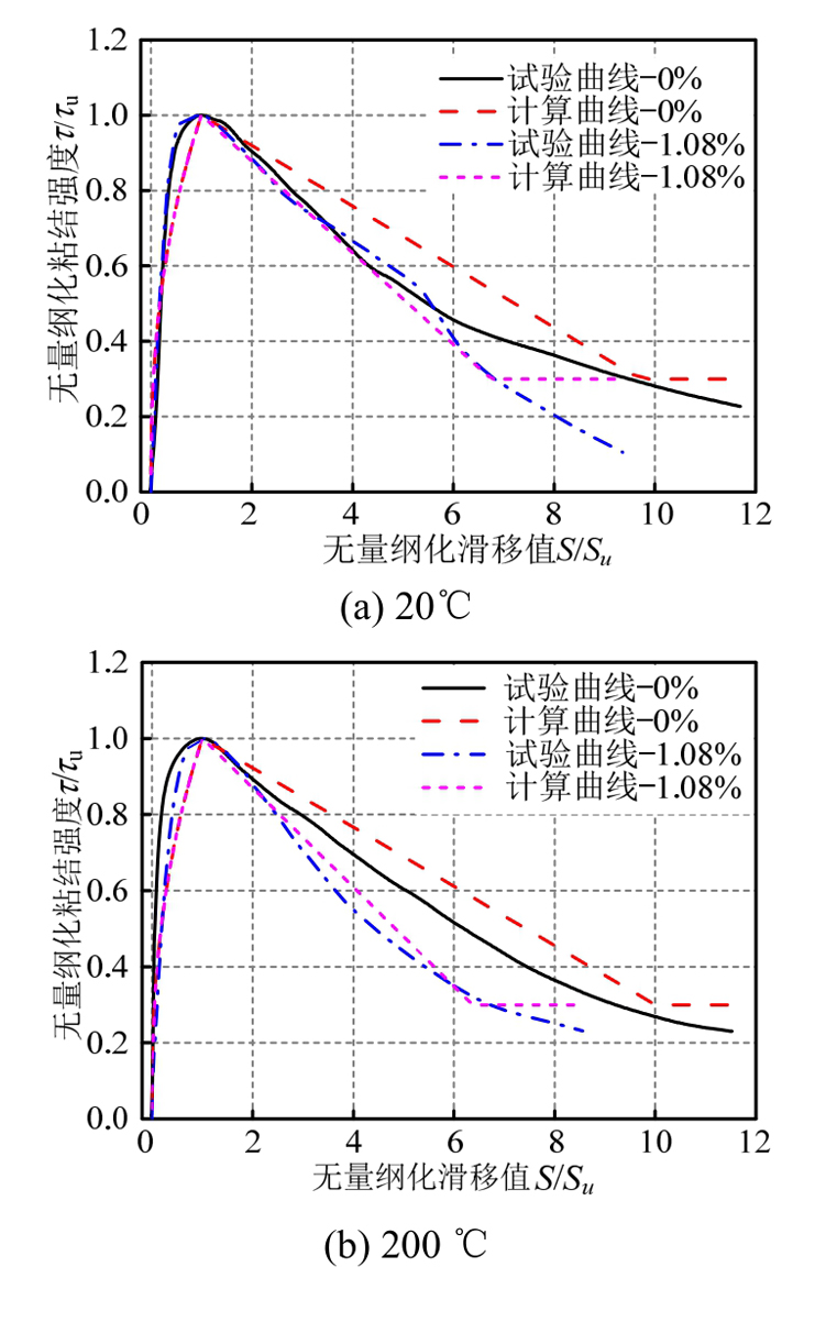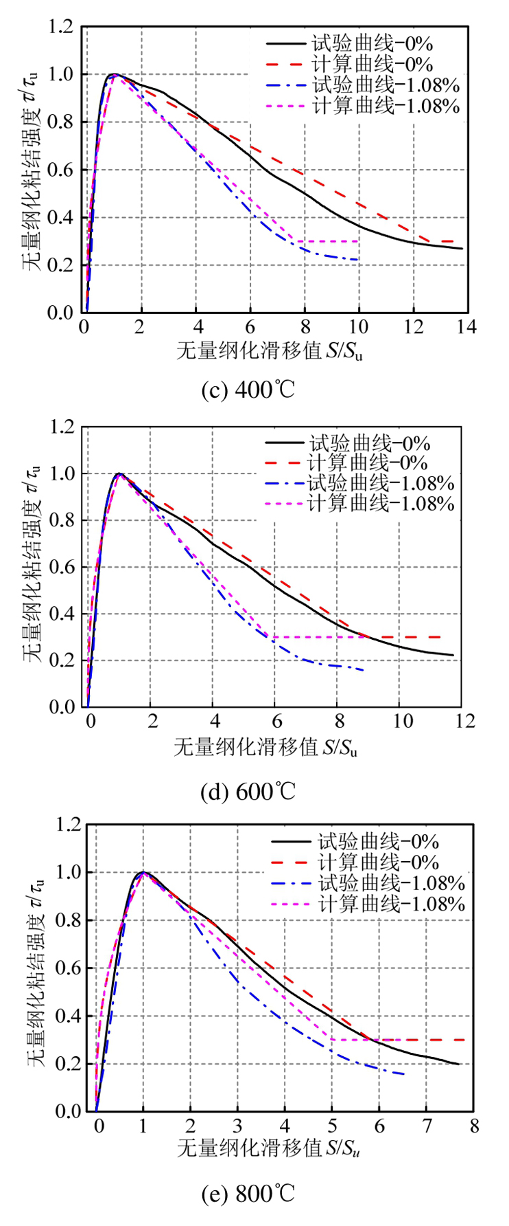 不同温度作用后试验值与计算值的无量纲化粘结滑移曲线绘于图11。由图可知:无论是锈蚀率为1.08%的锈蚀试件还是非锈蚀试件,两者的试验平均曲线与通过关系式得到的计算曲线吻合较好。