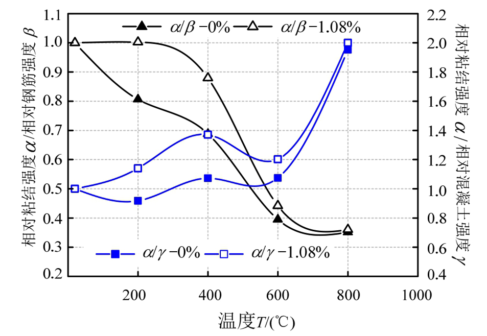 从图8可以发现:随着温度升高,相对粘结强度与相对钢筋极限强度的比值逐渐降低,而相对粘结强度与相对混凝土抗压强度比值逐渐增大;表明高温对变形钢筋-混凝土间粘结强度的损失要小于其对混凝土抗压强度的损失,而大于其对钢筋极限强度的损失。