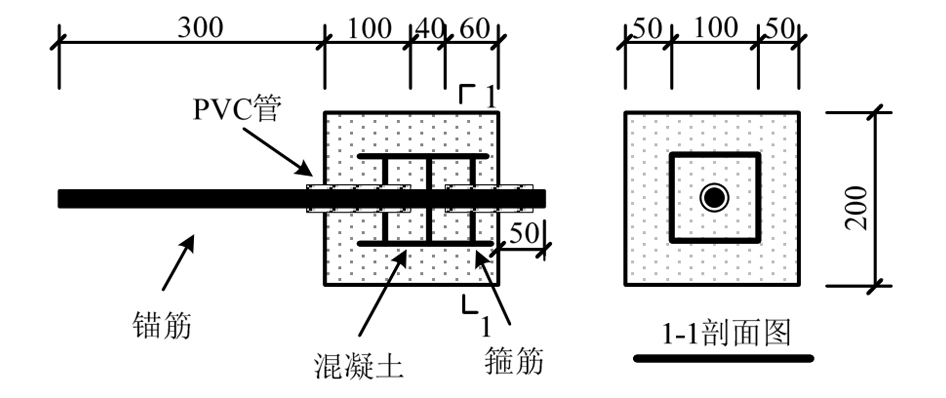 6@50的横向箍筋(箍筋等级为HRB300,其屈服强度fy、极限强度fu分别为332.21 MPa、456.36 MPa),以模拟现役工程实际中梁的箍筋加密区,粘结锚固长度设计为40 mm,在试件两端位置采用PVC管包裹钢筋,模拟无粘结段[17],同时在非粘结段与箍筋位置采用环氧树脂进行包裹,以避免其发生锈蚀而影响试验结果,试件几何尺寸如图1所示。试件所用混凝土配合比为水泥∶砂∶石∶水=1∶0.92∶1.95∶0.4,立方体试件标准养护 28 d并于室温风干后进行高温试验。高温后混凝土和钢筋的材料性能根据《普通混凝土力学性能试验方法标准》(GB/T 50081―2016)和《金属材料室温拉伸实验方法》(GB/T 228.1―2010)进行试验,测得不同温度作用后立方体试块残余抗压强度fcu、钢筋屈服强度fy、钢筋极限强度fu及钢筋的弹性模量Es,如表1所示。