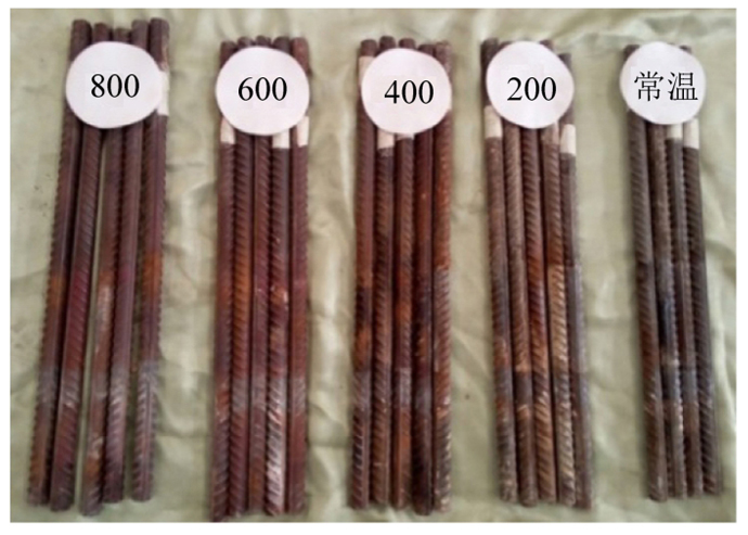 钢筋在锈蚀质量损失为1.08%的情况下,斜肋有部分点蚀的情况,但基本保持完好。经历高温作用并冷却后,锈蚀率为1.08%的试件与非锈蚀试件外观特征基本相似,钢筋表面颜色随其经历的温度有所区别,温度较高时钢筋表面还会出现碳化现象。观察其表面情况如下:200 ℃时,试件颜色基本不变(呈青灰色),棱角整齐,表面密实,钢筋表面颜色较常温时无明显区别;400 ℃时,试件局部呈暗红色,有细微裂纹,钢筋颜色呈浅红色;600 ℃时,试件呈暗红色,微裂纹增多,棱角局部缺损,钢筋颜色加深;最高温度达到800 ℃时,试件呈灰白色,有较宽的裂纹,表面疏松且局部脱落,钢筋表面颜色为红褐色且表面有剥落和碳化现象,拔出钢筋外观如图4所示。