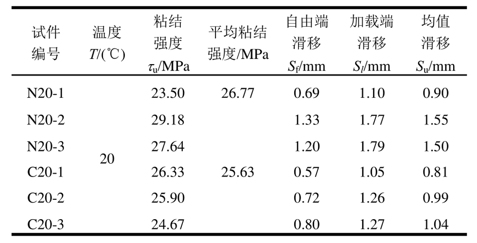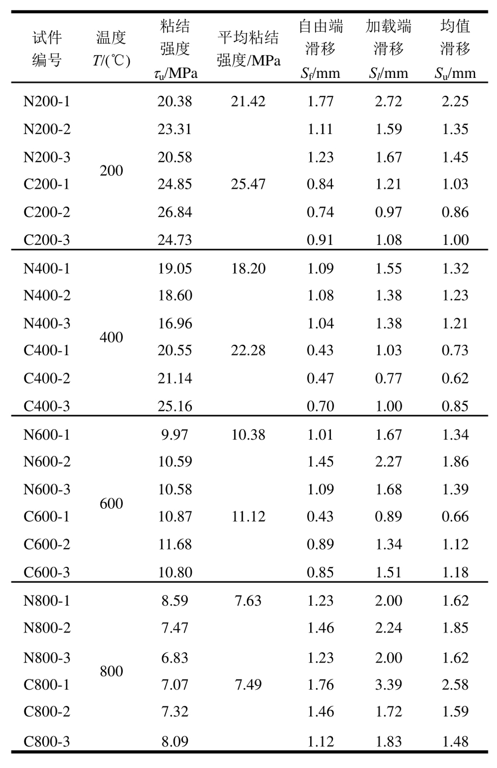 考虑到混凝土的离散性,本试验舍弃每组试件最大值、最小值,取中间3个试件进行研究,中心拔出试验的结果如表2所示,其中Sf为自由端峰值滑移,Sl为加载端峰值滑移,Su为加载端与自由端平均峰值滑移。试件编号中首字母C、N分别表示锈蚀率为1.08%的锈蚀试件、非锈蚀试件,字母后的数值表示受火温度,短横线后的数字表示同一试验条件下的试件编号。