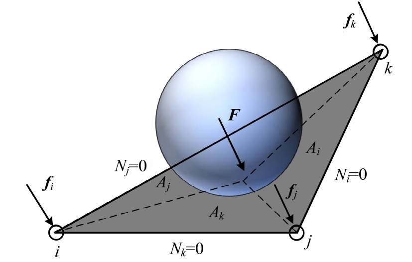 通常球体单元作用于三角形单元的表面,如图8所示。有限元计算需要输入节点的载荷,需要将离散元的接触力通过插值等效到三角形单元的节点上。节点力的插值是基于虚功等效原理,可表示为: