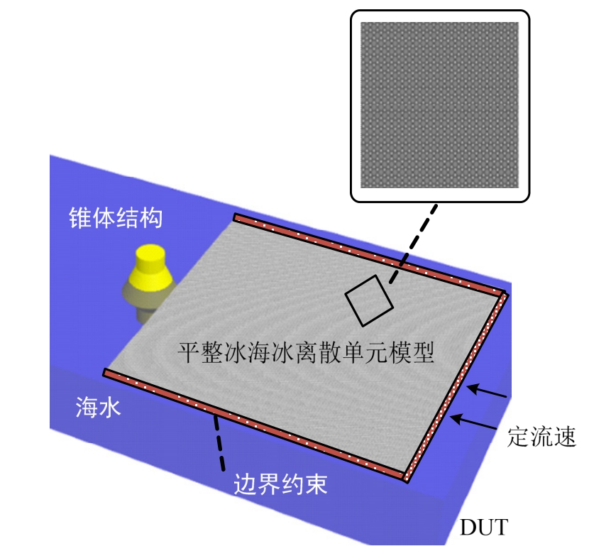本文通过平整冰离散元单元模型计算锥体结构的冰载荷。图1为平整冰与锥体结构相互作用的示意图,其中平整冰采用具有粘结-破坏的球体离散元单元构造。为模拟无限域的海冰,本文假设海冰模型在两侧的边界限制纵向(y方向)和垂向(z方向)的位移,并且在海冰的后侧施加流速边界,如图1所示。此外,在流体动力学方面,仅考虑水对离散单元的拖曳力以及浮力。