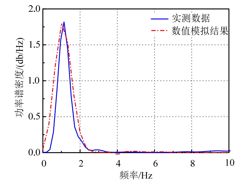 对实测数据和模拟结果进行频谱分析,如图19所示。图中表明模拟结果与实测数据的功率谱密度(PSD)曲线在频率上基本一致,其主导频率集中在1.0 Hz附近。其中,实测数据PSD峰值对应的频率为1.14 Hz,模拟结果峰值对应的频率为1.01 Hz。考虑到JZ20-2 NW平台的基频为1.07 Hz,因此可以认为该平台的冰激振动主要由1阶模态提供。