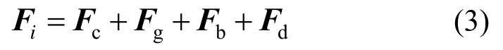 式中:Fc为海冰颗粒单元的接触力;Fg为单元受到的重力;Fb和Fd分别为海冰单元受到的浮力和拖曳力,可表示为: