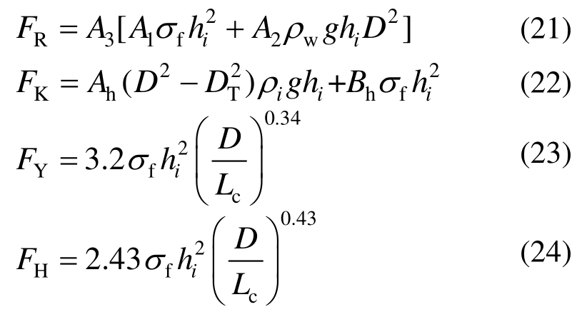式中:FR、FK、FY和FH分别为Ralstion、Kato、Yue和Hirayama锥体静冰力;A1、A2和A3为无量纲系数[36];Ah和Bh通过模型实验的回归分析得到[37];σf为海冰的弯曲强度;hi为海冰厚度;ρw为海水密度;ρi为海冰的密度;g为重力加速度;D为锥体直径;DT为锥顶直径;Lc为海冰的破碎长度。