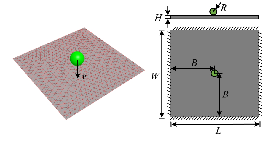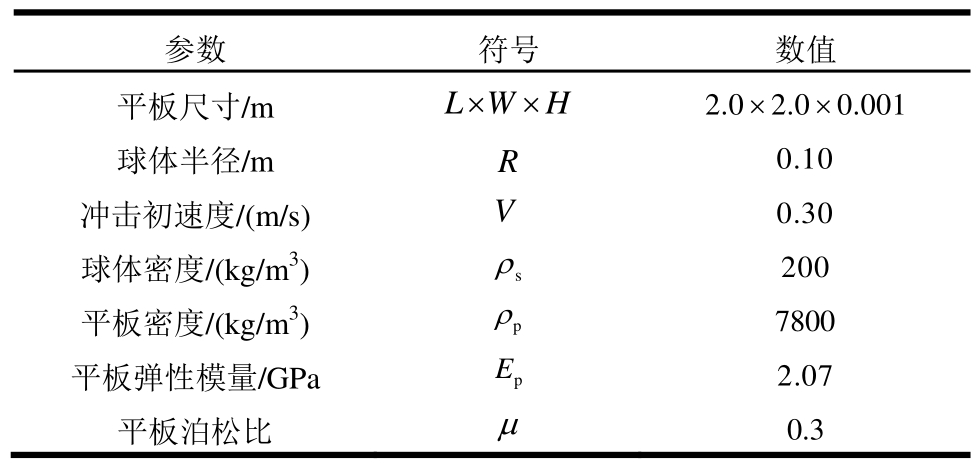 为验证DEM-FEM耦合方法的精度,下面采用单个球体以一定的初始速度冲击平板,如图9所示。相应的几何参数,如表1所示。这里分别采用DEM-FEM耦合方法和LS-DYNA软件对其进行对比分析。在DEM-FEM耦合方法中,球体采用离散元单元构造,平板由平板型壳单元组成;LS-DYNA采用刚性球体冲击由壳单元构造的平板。