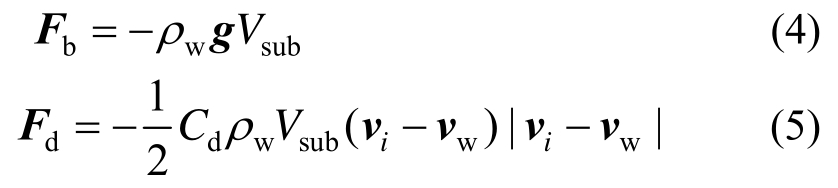 式中:ρw为水的密度;g为重力加速度;Vsub为单元浸入水中的体积;Cd为拖曳系数;vi为i单元的速度;vw为水流速度。