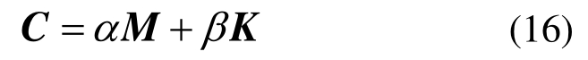 分别为结构的位移、速度以及加速度矩阵;Δt为时间间隔;θ为计算参数,为保证计算的稳定性,取θ=0.5。其中,C采用瑞雷阻尼构造,质量矩阵与刚度矩阵的线性组合,即: