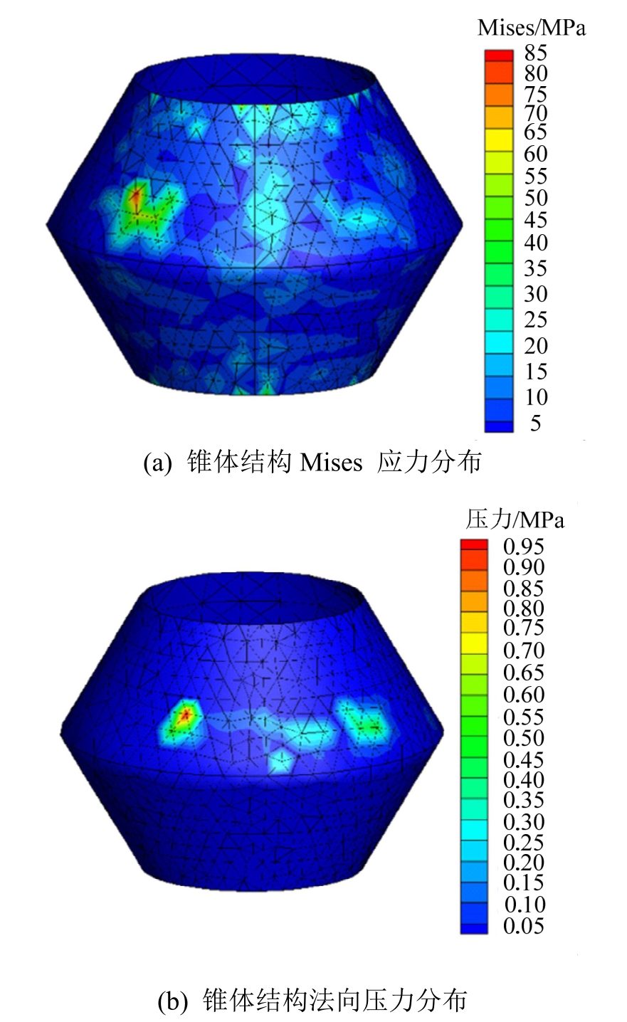 图21 海冰作用下锥体结构的应力及压力云图