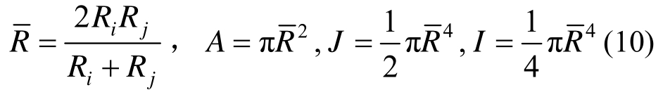 、J和I分别为颗粒接触的粘结面积、有效粘结半径、极惯性矩和惯性矩,即: