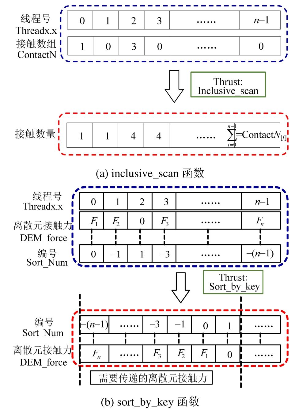 然后,采用 Thrust库中的 inclusive_scan和sort_by_key函数对耦合参数进行排序,如图7所示。图7(a)为通过inclusive_scan函数对颗粒与结构的接触数量进行排序,从图中可以看出排序后数组的最后一项为离散元与结构接触的总数。图7(b)是通过 sort_by_key函数对有效的接触力进行提取,需建立与线程号符号相反的数组。通过对该数据进行排序,可提取出连续有效的接触力、接触位置等数据,以便于传递到有限元计算中。