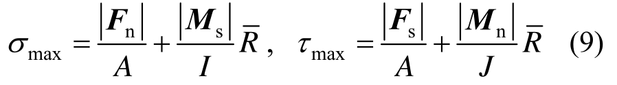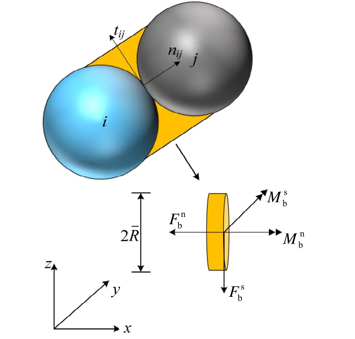 每个粘结颗粒单元间具有一定的粘结强度以传递两个粘结单元间的作用力和力矩,如图3所示。粘结单元间的最大拉应力和剪应力可依据梁的拉伸、扭转和弯曲理论按下式计算: