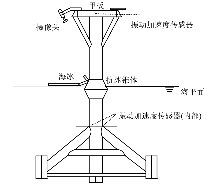 渤海 JZ20-2 NW 锥体导管架平台安装了完备的冰激振动立体监测系统,如图11所示。该监测系统主要包括了海冰图像监测和振动加速度传感器等,实现了对该海域冰速、冰厚、冰向、海冰密集度等海冰参数以及结构振动加速度长期系统的现场监测,为我国研究导管架冰激振动提供大量的现场实测数据。