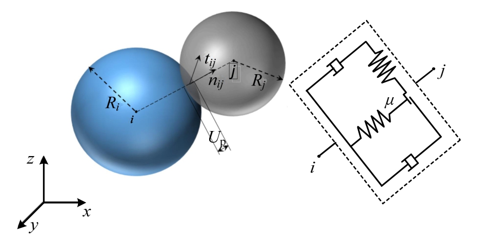 Fig.2 Contact model in the spherical DEM
