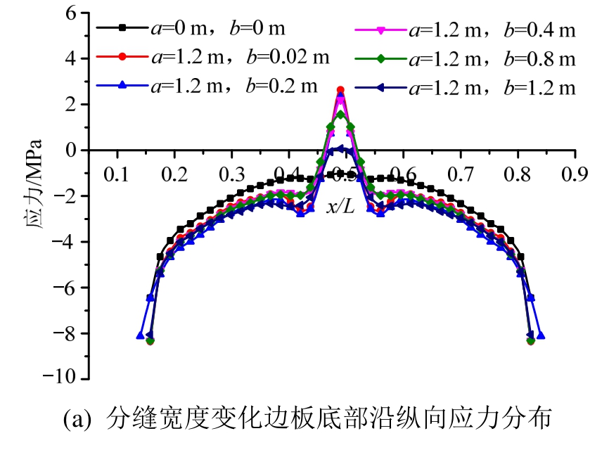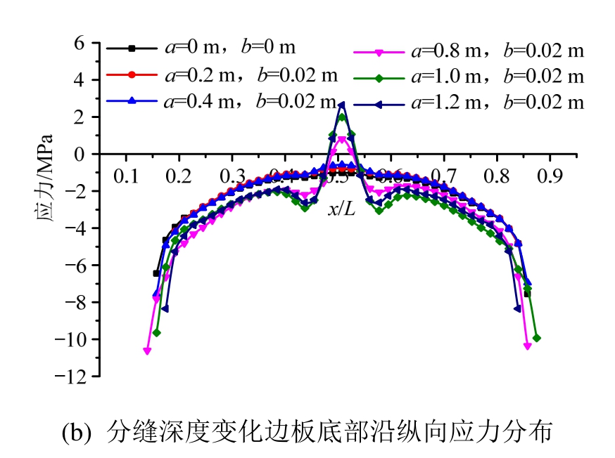 图13 分缝深度宽度变化边板底部沿纵向应力分布
