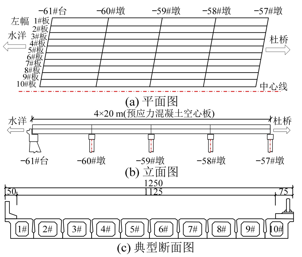 杨司高架位于台州临海杜桥,起止桩号K18+576.48~K22+102.52,全长3526 m,分为左右两幅,单幅每跨10片预应力混凝土空心板连续梁,以20 m跨径为主。下部结构采用桩柱式桥墩台,钻孔灌注桩基础。全桥按双向四车道标准建设,设计时速100 km/h。桥梁的平面图、立面图和典型断面图如图1所示。