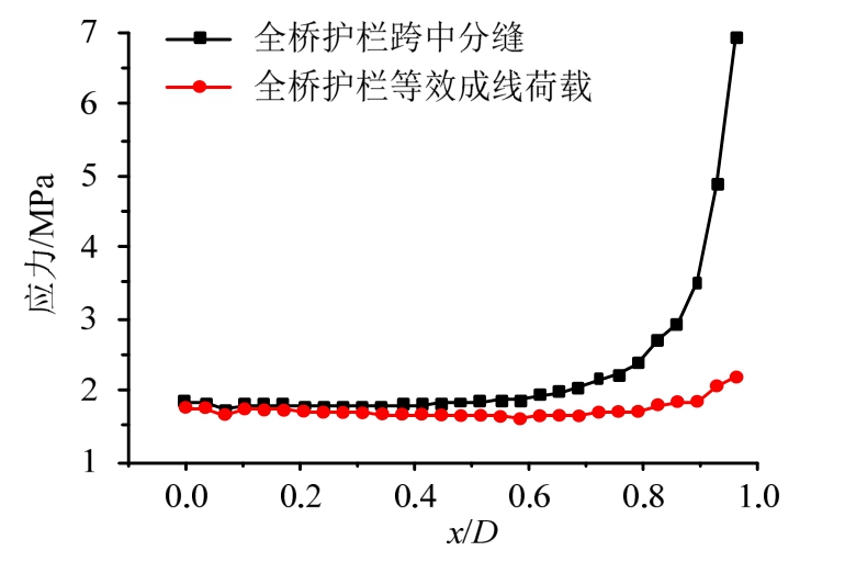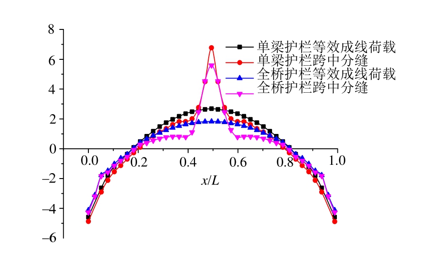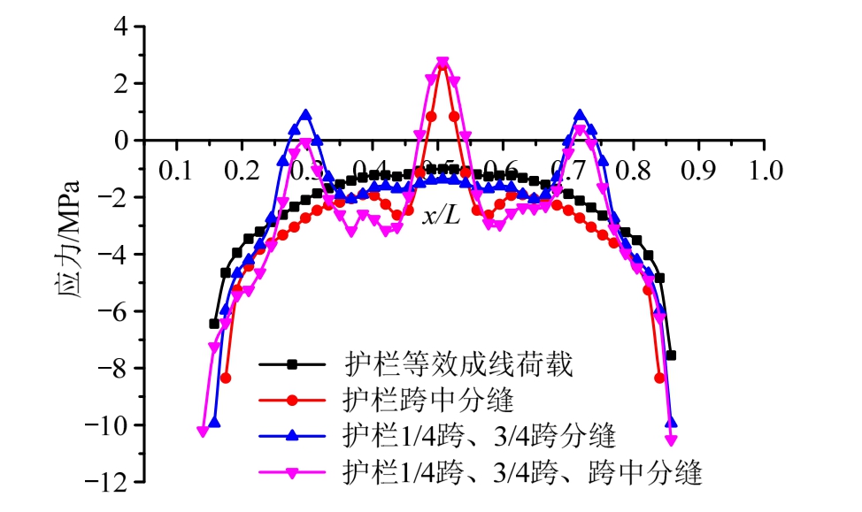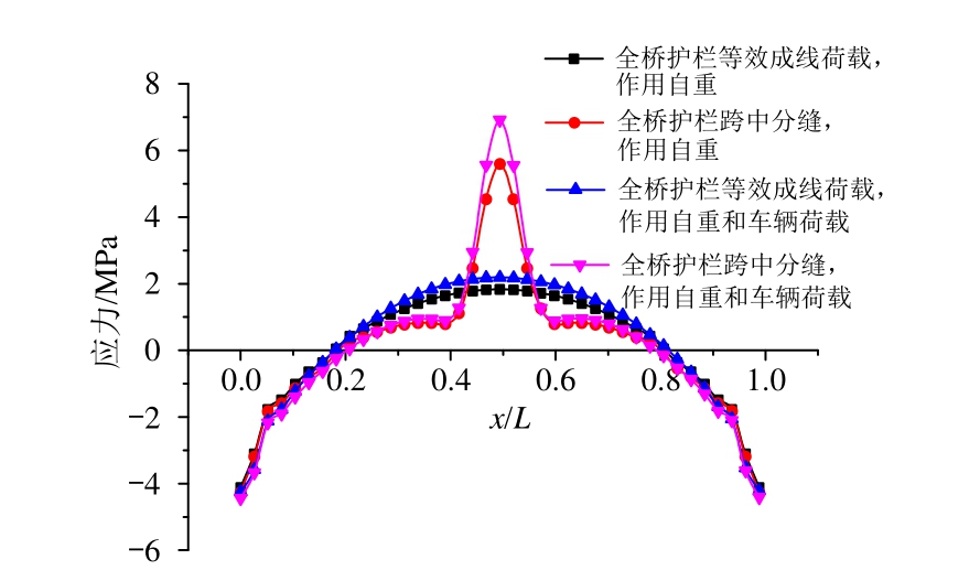 由图10可知:在自重作用下,护栏跨中分缝时,全桥模型和单梁模型边板底部沿纵向的应力均在x/L=0.4~0.6区域突然增大,跨中位置达到最大,全桥模型边板跨中底部最大应力为5.59 MPa,单梁模型为6.77 MPa;护栏等效为线荷载时,两种模型应力曲线比较平滑,全桥模型边板跨中底部最大应力为1.83 MPa,单梁模型为2.68 MPa。上述结果说明,无论是全桥模型还是单梁模型,护栏跨中分缝时二者边板底板存在应力集中,应力分布趋势一致。在护栏等效成线荷载时,单梁模型和全桥模型的跨中底部最大应力相差0.84 MPa,而分缝时,差值达到1.18 MPa,且全桥模型护栏分缝时边板跨中底部区域最大应力较无缝时增大3.76 MPa,单梁模型护栏分缝时增大4.09 MPa,说明对于单梁模型,横向分布效应会导致应力集中效应较全桥模型更明显。