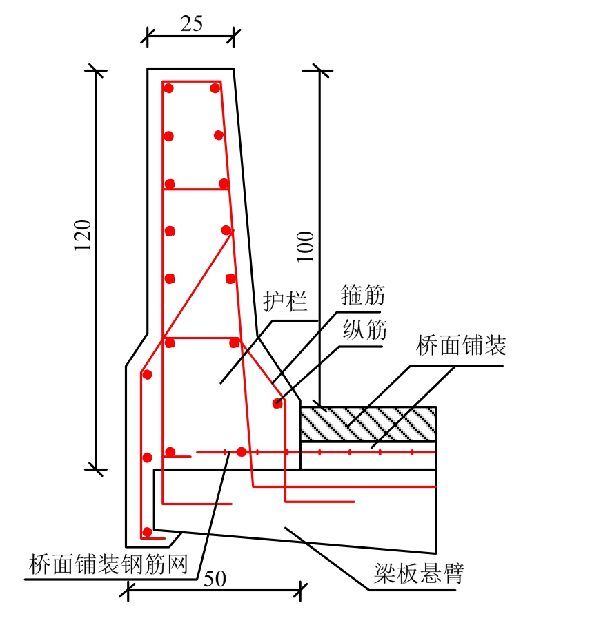 防撞护栏和混凝土空心板边板现浇成整体,护栏跨中分缝深度和护栏高度一致,为1.2 m,宽度为0.02 m。护栏与边板连接如图3所示。