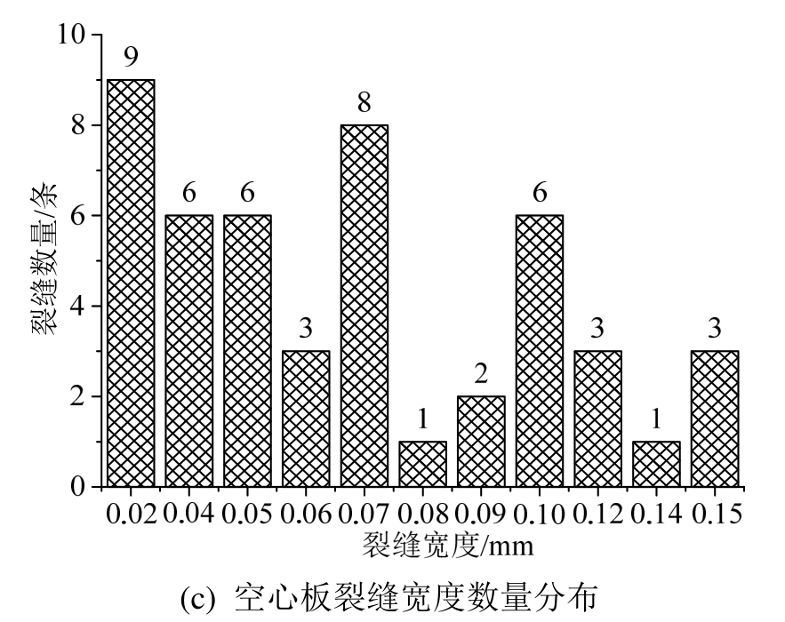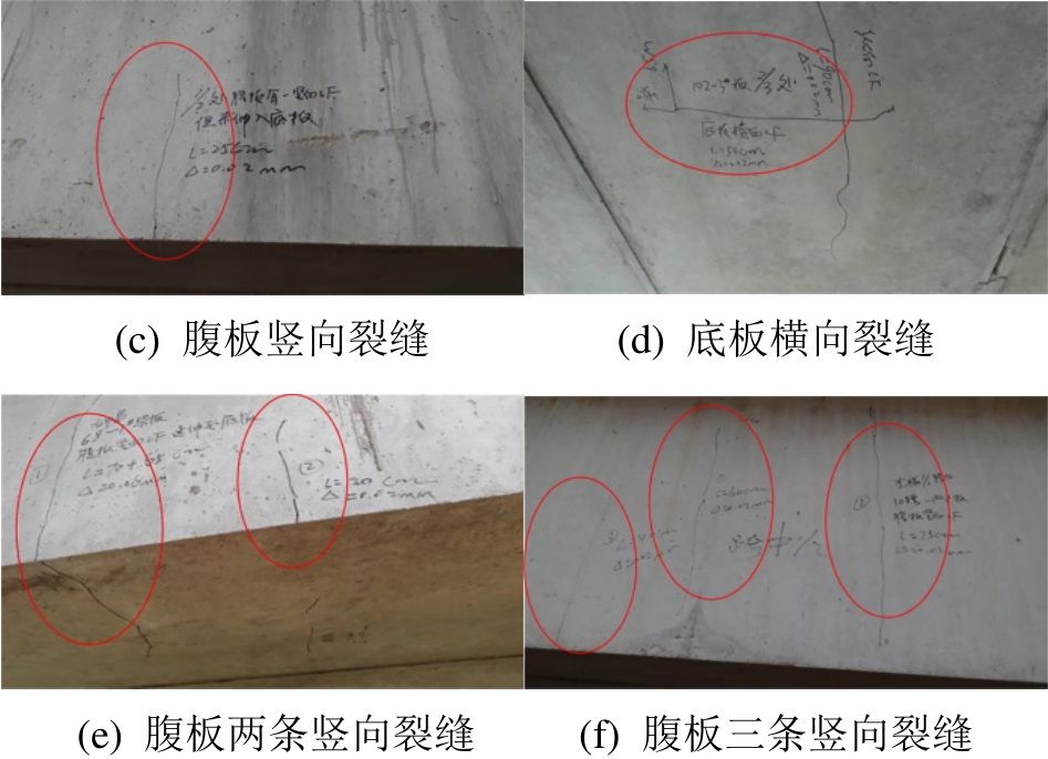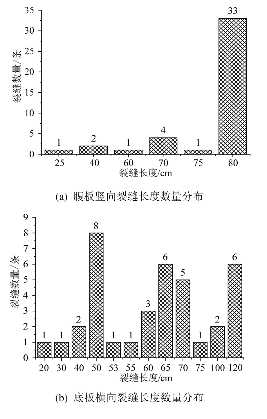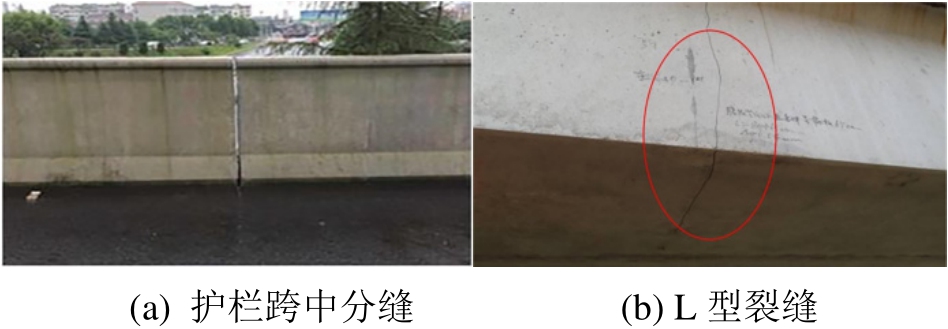 在2016年3月~6月进行的桥梁竣工检测中,发现杨司高架桥43片梁板出现结构裂缝,其中33片梁在护栏跨中分缝(图4(a))正下方腹板存在一条延伸至底板呈L型的裂缝(图4(b));5片梁腹板存在一条竖向裂缝但未在底板横向延伸(图4(c));2片梁底板存在一条横向裂缝且未延伸至腹板(图4(d));腹板存在两条竖向裂缝,一条延伸至底板并横向延伸另外一条仅延伸至底板的空心板共2片(图4(e));腹板存在三条竖向裂缝均未延伸至底板的空心板共1片(图4(f))。裂缝尺寸、数量信息如图5所示,L型裂缝如图6所示。