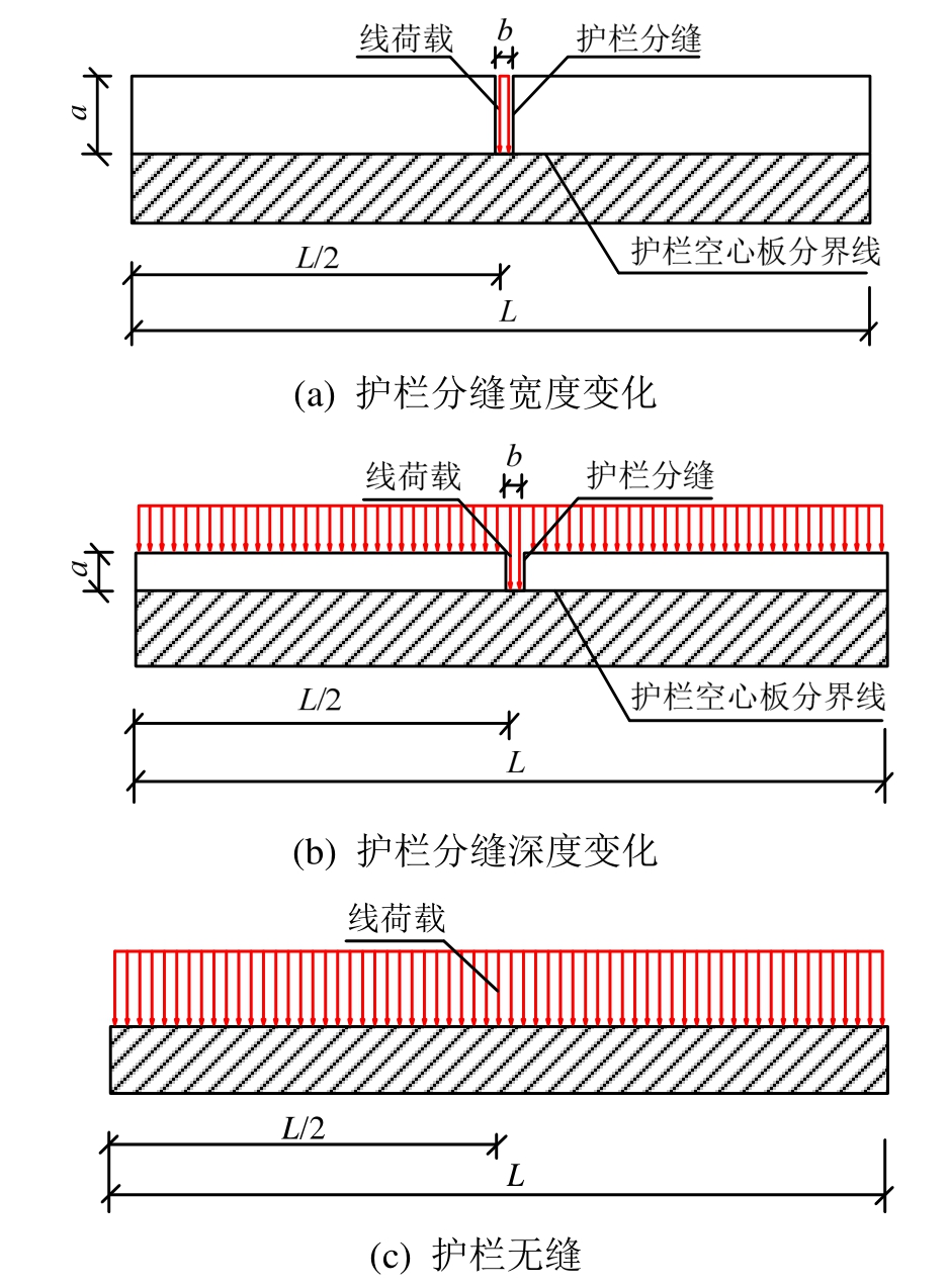 在分析分缝尺寸影响时,采用图7中a、b分别代表分缝深度和宽度,L代表边板长度。在分缝底部施加12.7 kN/m线荷载模拟混凝土护栏重力,保证不同分缝宽度情况下各工况有同样重力(图7(a));为确保分缝深度不同时截面有效高度一致(图7斜线部分),缝深和护栏的高度一致,采用调整护栏高度模拟分缝深度的影响,并通过在护栏上施加线性荷载补偿各工况间护栏高差引起自重荷载的区别,保证不同高度护栏有同样的重力(图7(b))。同时,在a=0 m、b=0 m(护栏无缝)时,护栏重力等效成线荷载施加在空心板上,确保截面有效高度一致(图7(c))。