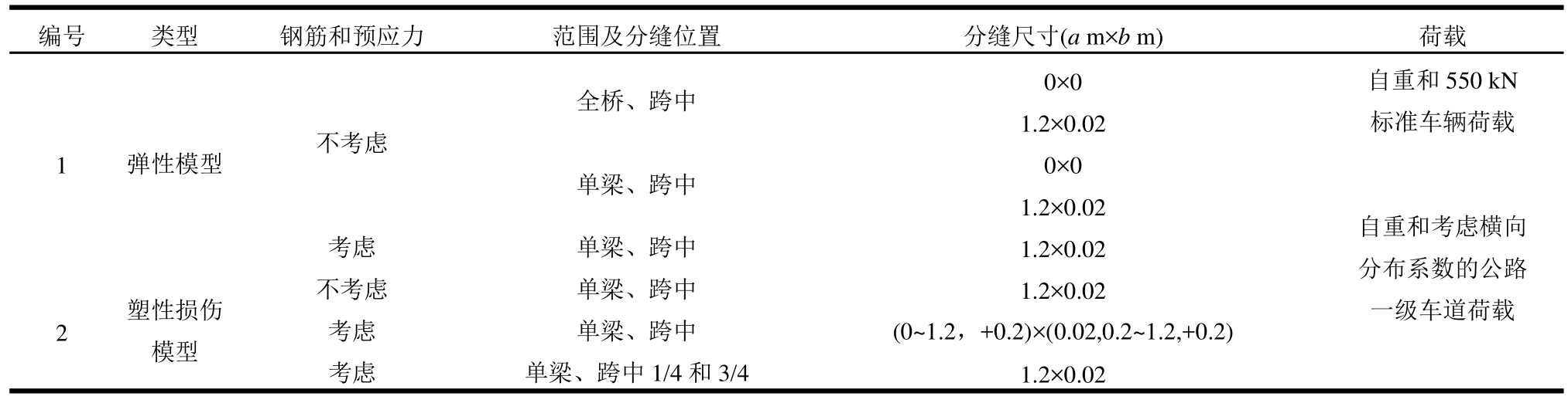 编号 类型 钢筋和预应力 范围及分缝位置 分缝尺寸(a m×b m) 荷载1 弹性模型 不考虑全桥、跨中 0×0 自重和550 kN标准车辆荷载1.2×0.02考虑 单梁、跨中 1.2×0.02 2 塑性损伤模型1.2×0.02单梁、跨中 0×0不考虑 单梁、跨中 1.2×0.02考虑 单梁、跨中 (0~1.2,+0.2)×(0.02,0.2~1.2,+0.2)考虑 单梁、跨中1/4和3/4 1.2×0.02自重和考虑横向分布系数的公路一级车道荷载
