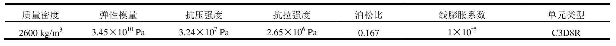 质量密度 弹性模量 抗压强度 抗拉强度 泊松比 线膨胀系数 单元类型2600 kg/m3 3.45×1010 Pa 3.24×107 Pa 2.65×106 Pa0.167 1×10-5 C3D8R