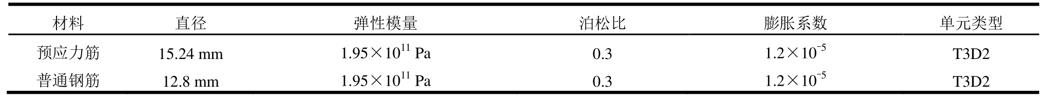 材料 直径 弹性模量 泊松比 膨胀系数 单元类型预应力筋 15.24 mm 1.95×1011 Pa 0.3 1.2×10-5 T3D2普通钢筋 12.8 mm 1.95×1011 Pa 0.3 1.2×10-5 T3D2