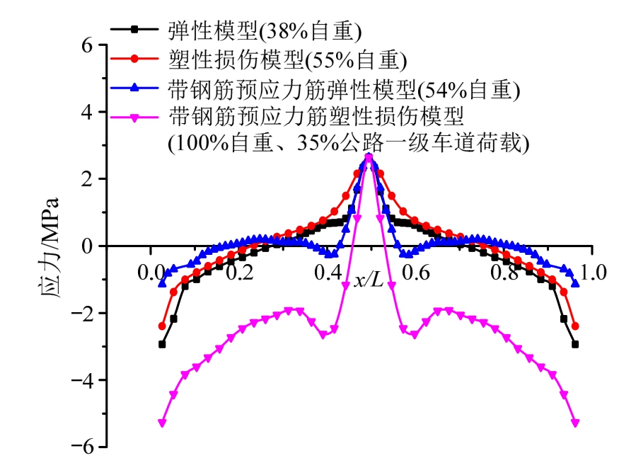 在图12中,带钢筋和预应力筋的塑性损伤模型跨中底板应力达到2.65 MPa时临界开裂荷载为100%自重和35%公路一级车道荷载,为方便对比,各工况均施加该临界开裂荷载。边板底部沿纵向应力分布如图13所示。