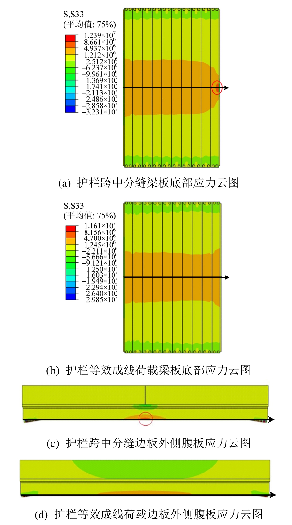 由图11可知:护栏跨中分缝时,有汽车荷载时边板跨中底部区域最大应力达到6.91 MPa,无汽车荷载作用时为5.59 MPa,两者相差1.32 MPa。护栏等效成线荷载时,有汽车荷载比纯自重作用应力增幅为0.36 MPa。说明综合考虑汽车荷载后,应力集中效应会加剧,其增长速度大于横向分布导致应力的增加速度。