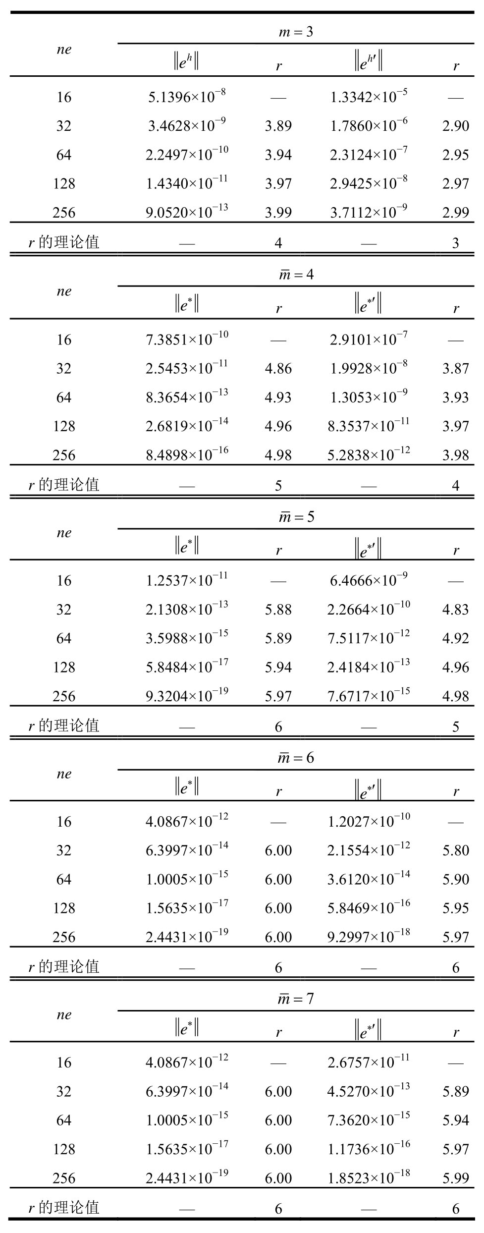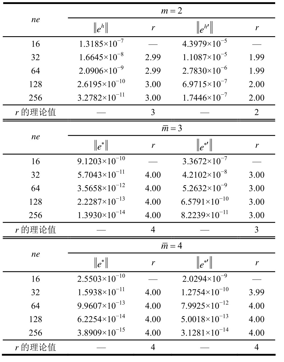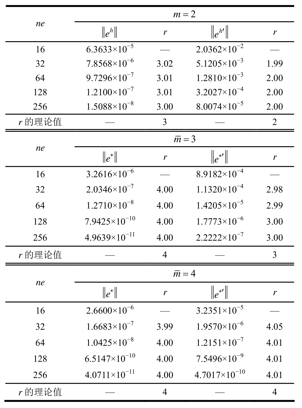 2 ne m=e r h e′ r h 16 6.3633×10-5 — 2.0362×10-2 —32 7.8568×10-6 3.02 5.1205×10-3 1.99 64 9.7296×10-7 3.01 1.2810×10-3 2.00 128 1.2100×10-7 3.01 3.2027×10-4 2.00 256 1.5088×10-8 3.00 8.0074×10-5 2.00 r的理论值 — 3 — 2 ne m=3 e* r e*′ r 16 3.2616×10-6 — 8.9182×10-4 —32 2.0346×10-7 4.00 1.1320×10-4 2.98 64 1.2710×10-8 4.00 1.4205×10-5 2.99 128 7.9425×10-10 4.00 1.7773×10-6 3.00 256 4.9639×10-11 4.00 2.2222×10-7 3.00 r的理论值 — 4 — 3 ne m=4 e* r e*′ r 16 2.6600×10-6 — 3.2351×10-5 —32 1.6683×10-7 3.99 1.9570×10-6 4.05 64 1.0425×10-8 4.00 1.2151×10-7 4.01 128 6.5147×10-10 4.00 7.5496×10-9 4.01 256 4.0711×10-11 4.00 4.7017×10-10 4.01 r的理论值 — 4 — 4