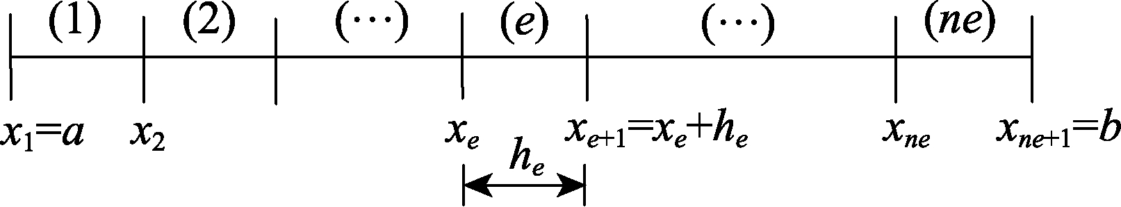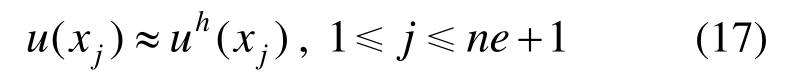 利用上述弱形式可对该非线性边值问题进行有限元求解。首先对结构进行离散,如图1所示。记单元个数为ne,结点坐标为xj (j=1,2,…,ne+1),单元尺寸为he (e=1,2,…,ne)。