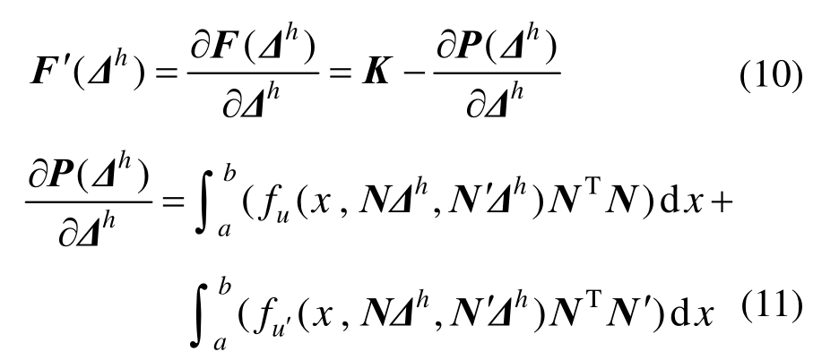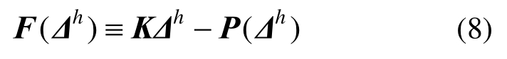 对本文的非线性问题,荷载向量P(Δh)是整体自由度Δh的非线性函数关系,因此该方程组是一个非线性方程组,需进行迭代求解。本文采用Newton法进行迭代求解,具体求解过程如下。记: