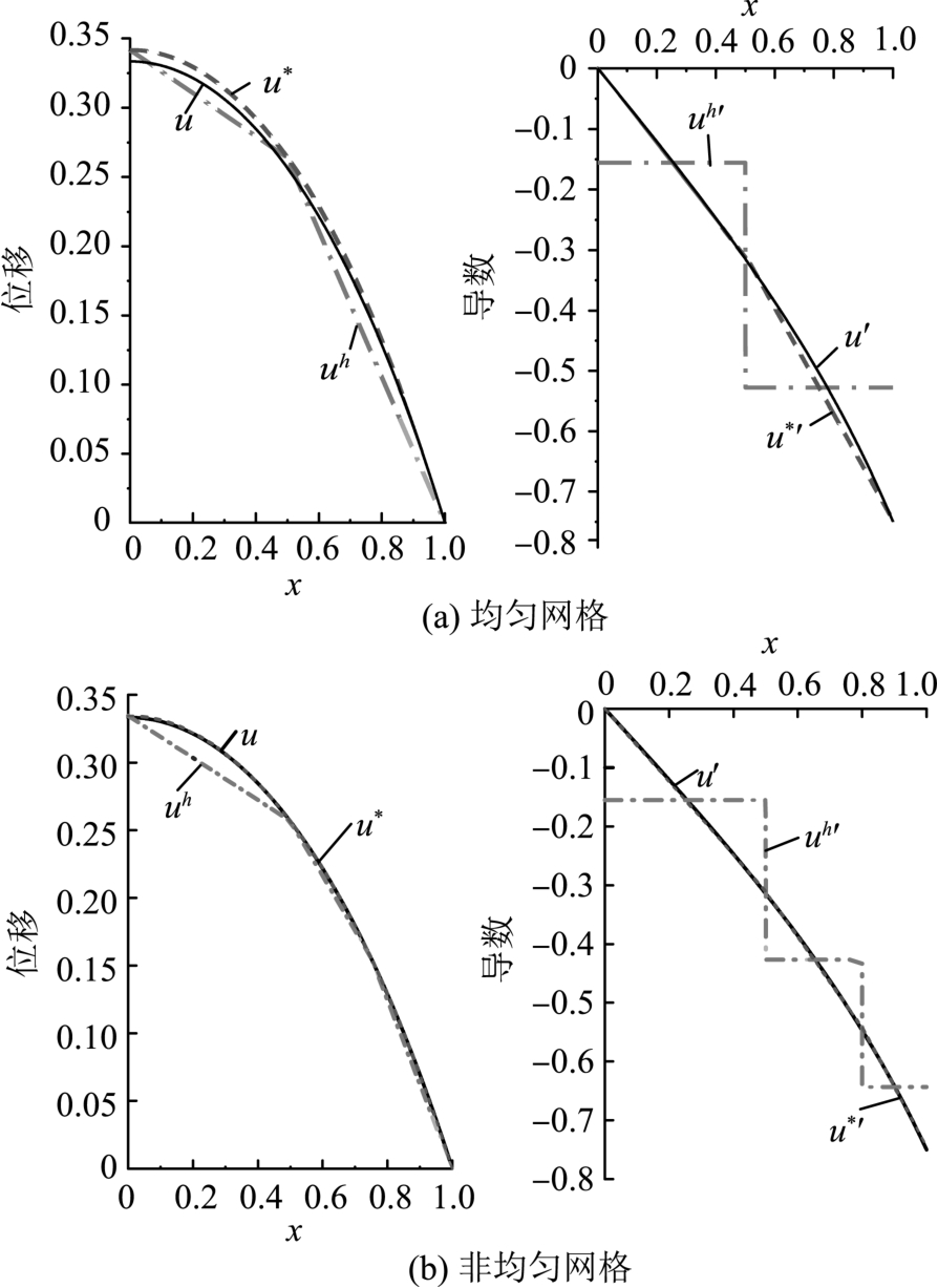 =2)进行超收敛修复,有限元解、超收敛解与精确解的对比如图3所示。易见,无论是均匀网格还是非均匀网格,本文方法的修复效果均非常显著。
