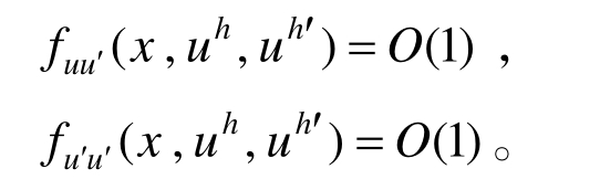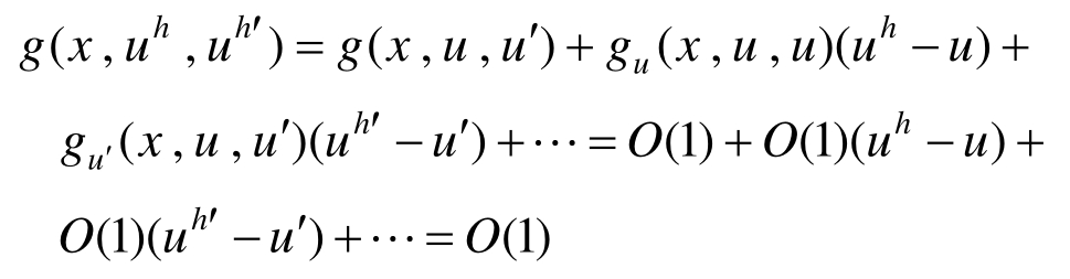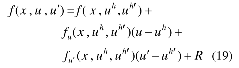 采用更高次单元求解该边值问题可获得单元上的超收敛解。但该边值问题仍是非线性的,需迭代求解,为避免迭代求解,对方程右边项f(x,u,u′)在有限元解答处作Taylor展开,有: